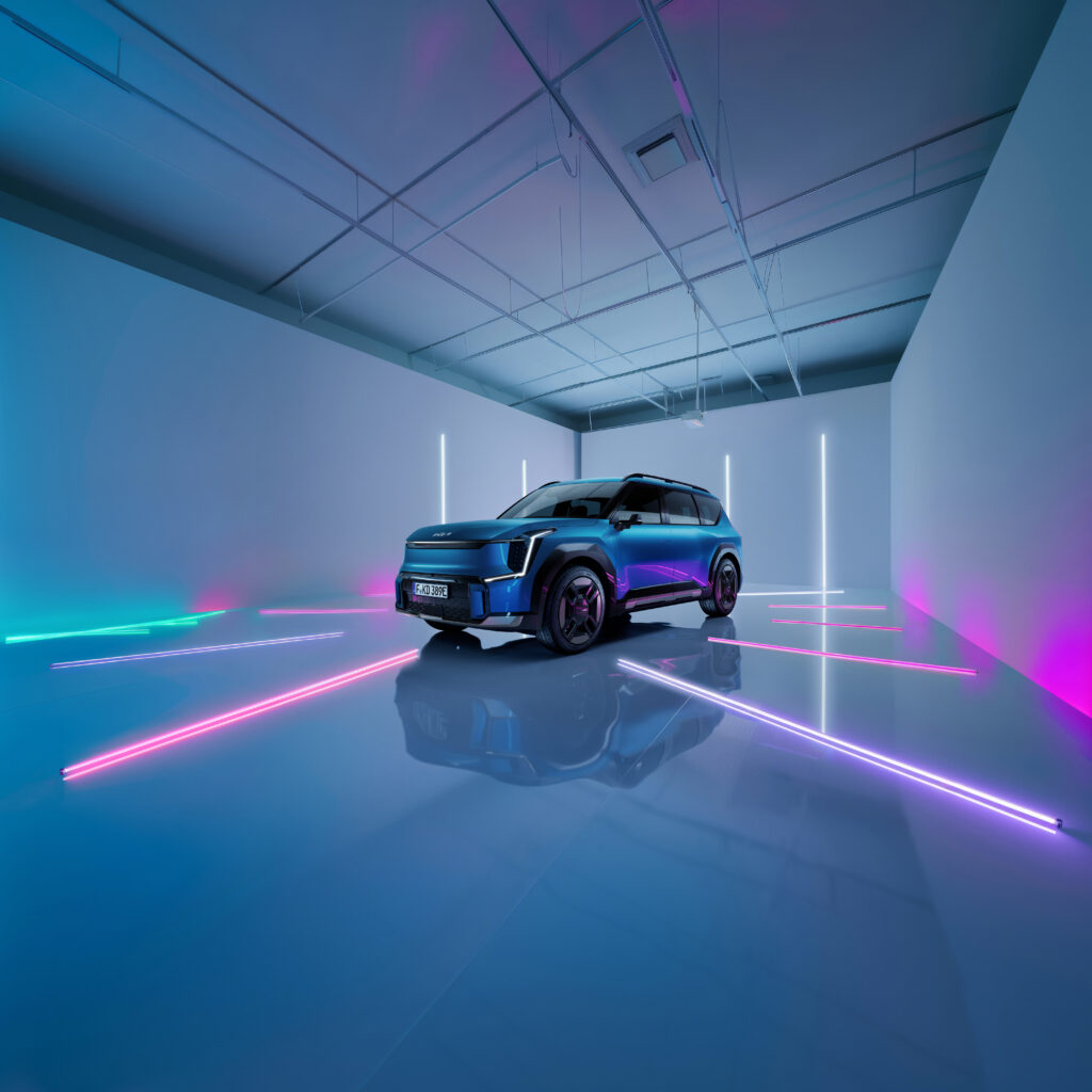 Eine weitere Innovation bietet das „Swivel“-Paket mit der Möglichkeit, die Sitze der zweiten Reihe um 90 Grad zur Tür hin zu schwenken oder durch die Drehung um 180 Grad den Passagieren in der dritten Reihe gegenüberzusitzen. Doch nicht nur diese Ausstattungsmerkmale bieten ein hohes Maß an Komfort. Lederalternativen aus Bio-Polyurethan sowie Stoffe und Teppiche aus recyceltem PET sorgen im Interieur des EV9 für erstklassige Aufenthaltsqualitäten im Sinne der Nachhaltigkeitsstrategie von Kia.